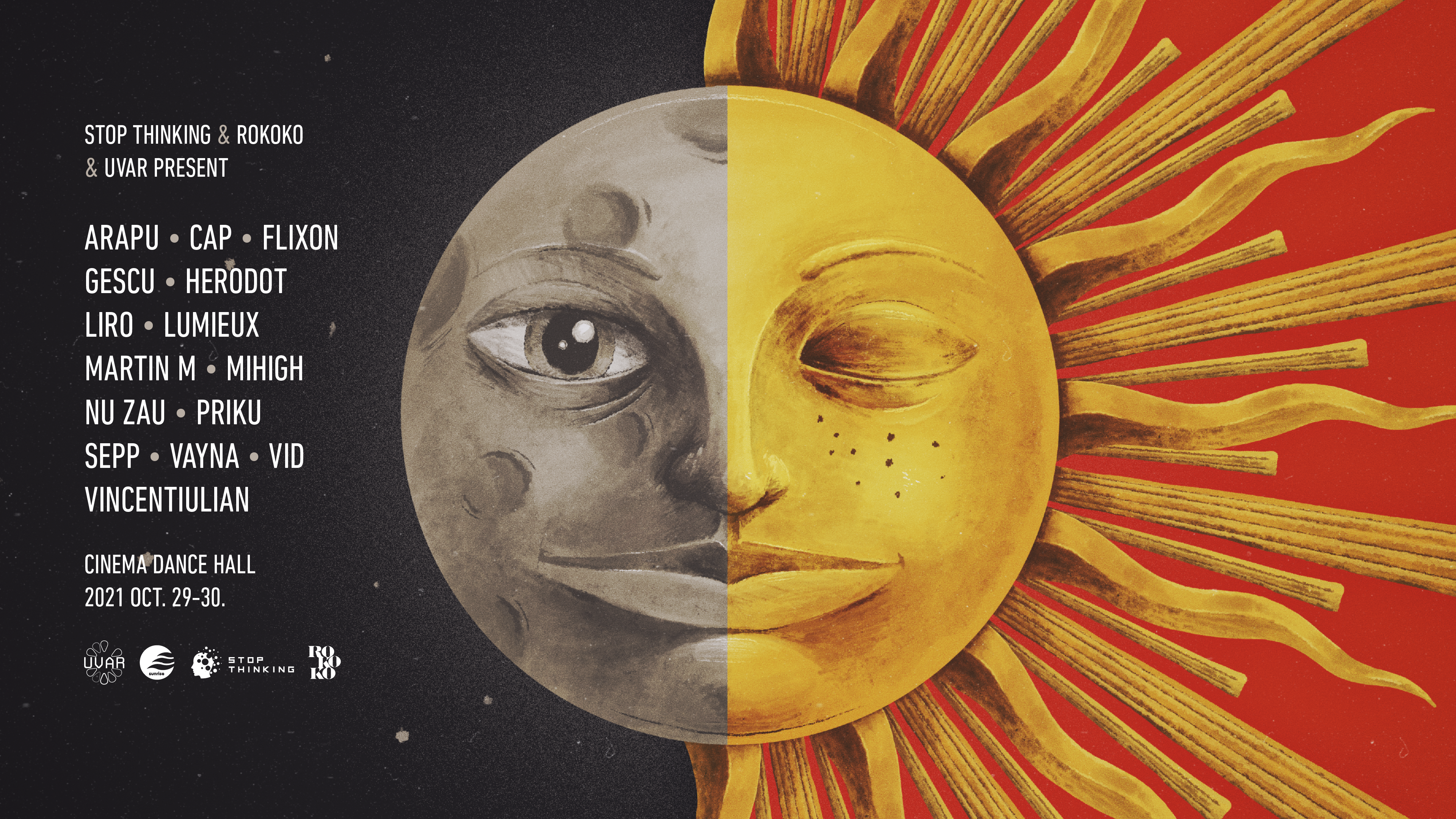 Flyer for the two day long mini-festival by Stop Thinking, Rokoko and Uvar, headlined by some of the greatest names in the minimal music scene.